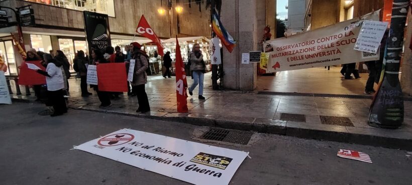 Contro il militarismo si intona la canzone del disertore, rimodulata sull’aria di un canto alpino della Grande Guerra. Si improvvisa anche una lezione di storia contemporanea, visto che siamo in via Generale Magliocco, un aviere che bombardò la Libia con l’iprite e morì poi nel ’36 durante l’occupazione dell’Etiopia – e raccontiamo che l’Italia, con la Gran Bretagna, fu il primo Paese al mondo ad usare armi chimiche (già nel 1911) col suo “imperialismo da straccioni”, come lo definì Lenin.