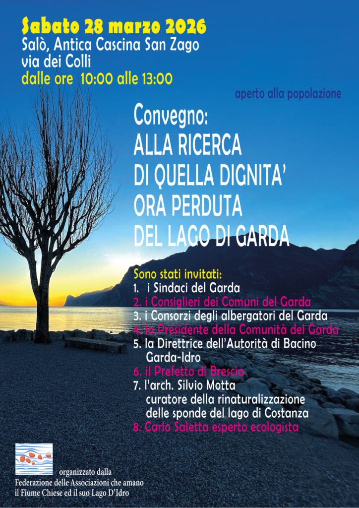 La Federazione del Chiese – che annovera decine di formazioni sociali operanti dalla sorgente alla foce del corpo idrico stesso e del Lago d’Idro e di cui è ben nota l’attività formale, unitaria e costante di salvaguardia dell’intero corpo idrico del Chiese dall’ottobre 2018, ha organizzato un CONVEGNO per SABATO 28 MARZO 2026 dalle ore 10:00 alle 13:00 presso l’Antica Cascina San Zago di Salò, in via dei Colli.
