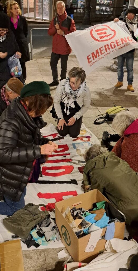Su un grande telo bianco è stato scritto con stoffe di diversi colori, cucite a mano da un gruppo di persone, per lo più donne ma anche qualche maschio: “Il PRESIDIO R1PUD1A LA GUERRA”. Questo lavoro condiviso tra i vari partecipanti ha espresso il concetto chiave della campagna R1PUD1A di Emergency, campagna che si rifà all’art. 11 della Costituzione. Sono costruiti e donati anche degli scampoli di pace, gli “straccetti di pace”, piccole strisce di tessuto bianco che richiamano i valori di Emergency della pace, del ripudio della guerra, del terrorismo e della violenza.