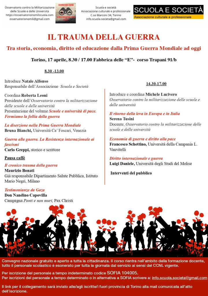 L’assemblea nazionale dell’Osservatorio contro la militarizzazione delle scuole e delle università e il convegno, intitolato ‘Il trauma della guerra’, organizzato dal coordinamento insieme all’Associazione Scuola e Società, in svolgimento a Torino nelle date di giovedì e venerdì 17-18 aprile prossimi focalizzeranno l’attenzione sui nessi tra storia, economia, diritto ed educazione dalla Prima Guerra Mondiale ad oggi nella prospettiva che in Europa venga reintrodotta la leva obbligatoria.