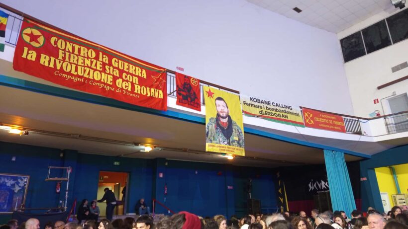 In un ritrovarsi di diverse realtà collettive convergenti, dopo sette anni dalla morte di Lorenzo Orsetti – Orso -Tekoser, “combattente” per la difesa del Confederalismo Democratico del Rojava, la comunità fiorentina ricorda ed allarga lo sguardo accogliendo esperienze di scelte di contrapposizione all’escalation di guerra globale. Sono presenti, oltre la famiglia di Lorenzo, con Alessandro, il padre, che del figlio porta soprattutto il tema della scelta di contrapposizione al capitalismo ed al patriarcato, l’anarchia quale strada per rompere il sistema dei poteri, l’internazionalismo quale alternativa, anche i portuali dei CALP di Genova, che nel portare i propri corpi a bloccare le navi militari testimoniano quel boicottaggio nonviolento necessario per essere coerenti nelle prassi; sono presenti anche da remoto i compagni e le compagne che sono adesso a Cuba dove stanno portando solidarietà fatta di pratiche di solidarietà e di contrapposizione ai blocchi, di riconoscenza per chi ha messo la propria esperienza (medica) a servizio anche di altri popoli (i medici rivoluzionari); è presente, sempre da remoto, anche Tony che è stato protagonista nel percorso di rottura dei blocchi verso Gaza con la Flotilla; è presente Dario che continua a essere rappresentante di una esperienza collettiva di lotta di quella che resterà la più importante esperienza di movimento di lavoratori a servizio di una dimensione più grande, contro l’accelerazione oligarchica che viviamo massima in questo tempo. Proprio Dario ricorda l’importanza di stare dentro le contraddizioni delle scelte, porsi accanto senza giudizio, cogliere le prospettive di azioni scomode. Chiaramente non si tratta di idealizzare un martire e nemmeno di leggere di questo la scelta della fuga dal sistema, anche se restano queste due visioni partigiana ed anarchica insieme; forse resta proprio la volontà di trovare forme di lotta che tengano insieme la contrapposizione al potere forte egemonico dittatoriale attraverso un insieme di pratiche, alcune nonviolente, altre che utilizzano strumenti in cui non sempre dobbiamo riconoscersi in modo unanime. Stare sui contorni di queste scelte, rispettare e al tempo stesso portare gratitudine, ringraziare un padre, una madre, una sorella, riconoscersi nell’umano bisogno di essere vivi e vive e testimoniare che un altro mondo è possibile. A Lorenzo, ma soprattutto ad Alessandro, Annalisa, Chiara, alle compagne e ai compagni che quotidianamente scelgono da che parte stare.