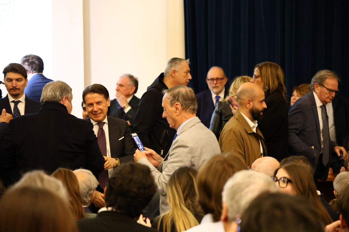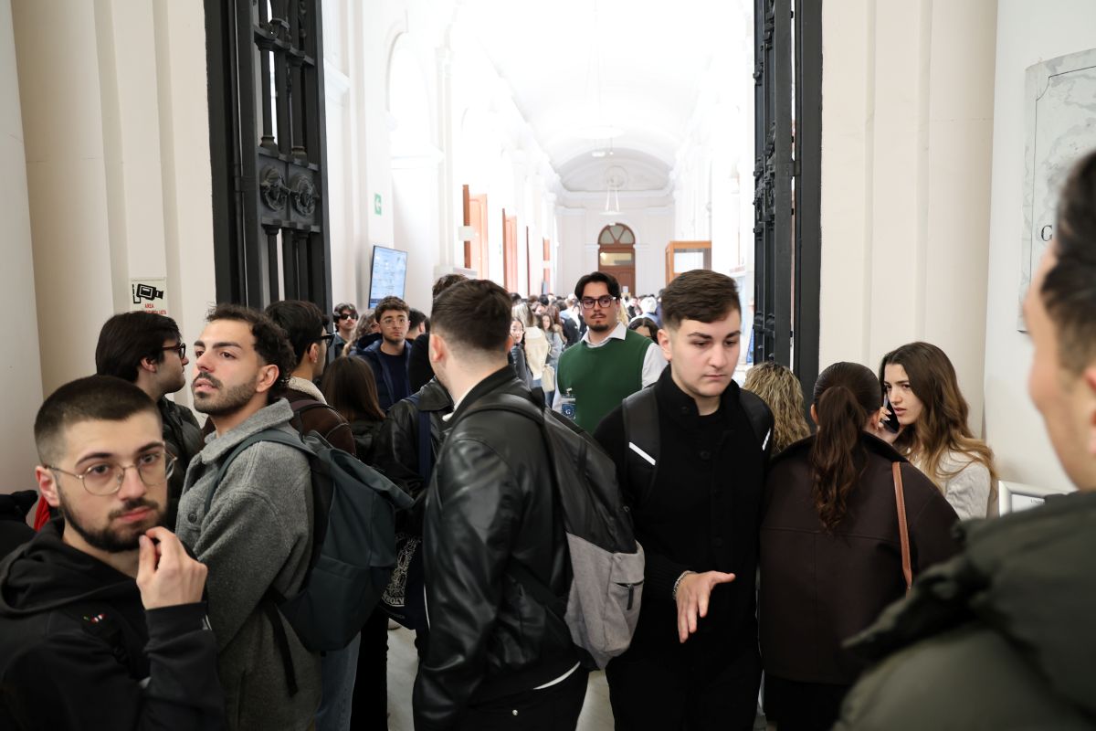 Proprio nell’aula aggiuntiva predisposta per i giovani rimasti fuori dalla sala principale, Giuseppe Conte e Gennaro Sangiuliano hanno fatto una prima sosta prima dell’avvio del dibattito, salutando gli studenti che non erano riusciti a entrare nella sala Pessina. È stato lì che il clima si è alleggerito per un momento in uno scambio legato al loro passato universitario comune: Sangiuliano ha ricordato di avere sostenuto un esame con Conte docente, e il leader del Movimento 5 Stelle gli ha risposto con una battuta sorridente, prima che il confronto entrasse nel vivo.