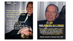 Nel secondo dopoguerra si afferma come uno dei più autorevoli politici italiani. E’ dal 1974, subito dopo la battaglia comune con i Radicali per il divorzio, che Giuliano Vassalli propose al Partito Socialista la sua bozza complessiva per “una giustizia giusta” – così la titolò – che, oltre la separazione delle carriere dei magistrati prevedeva anche la responsabilità civile/penale dei magistrati.