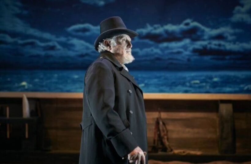 Lo spettacolo inizia, ma per i primi 20 minuti il capitano Achab non appare. Eppure, la sua presenza si avverte, ogni volta che entra qualcuno in scena potrebbe essere lui, saranno in 9 alla fine sulla scena, tutti rigorosamente uomini, come su una baleniera deve essere. Giovani e meno giovani, coraggiosi, goffi, cialtroni, tutti sbeffeggianti la vita. Ma poi c’è l’ufficiale, il quacchero Starbuck, quello che prova a resistere ad Achab, quello che, quando la profezia iniziale dice che uno solo si salverà, tutti pensano a lui, lui che vuole salvare le vite dei suoi, lui che cerca di frenare il delirio del suo capitano. Sarà lui a salvarsi?