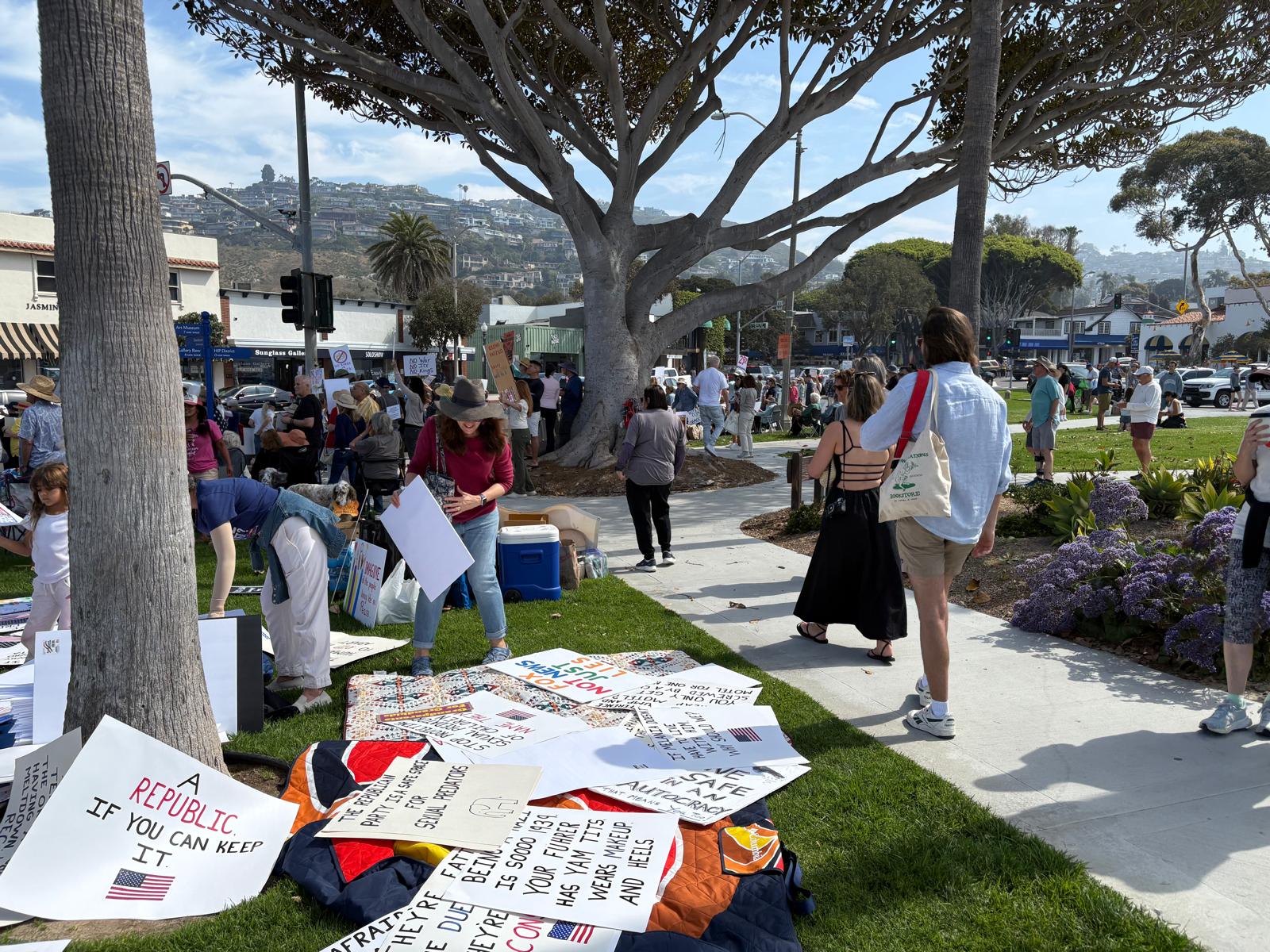 L’area di Laguna piace molto agli artisti, che spesso la scelgono come luogo dove ritirarsi in pace. Noto una creatività raffinata e giocosa: per esempio un signore ha dipinto una Monarch, la farfalla simbolo della California, e sotto vi ha scritto “questo è l’unico monarca arancione che voglio vedere!” Il lepidottero negli anni Ottanta era praticamente estinto a causa di pesticidi e inquinamento; da qualche anno finalmente i californiani ne celebrano il ritorno, anzi, apprendo con stupore che, pur essendo una farfalla migratrice, lascia le Montagne Rocciose quando arriva l’inverno, gli esemplari che scendono nel Sud della California si ambientano stabilmente e non emigrano più. Per anni lo Stato si è impegnato in una campagna per salvarla e quasi ogni californiano ha creato un angolo di ristoro per lei nel proprio giardino. Pare che la tecnica abbia funzionato (però mi chiedo perché dobbiamo sempre arrivare a vedere il peggio davanti a noi per tirare fuori il meglio di noi e il No Kings non fa eccezione).