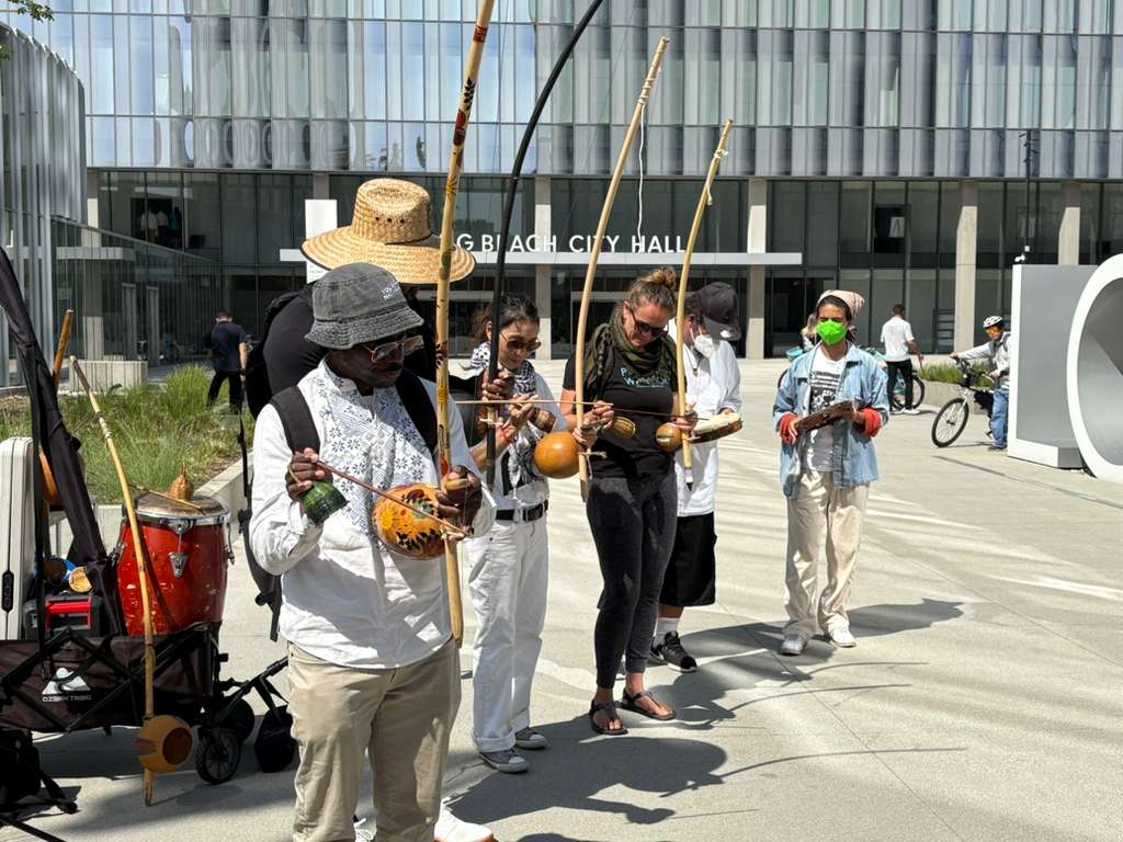 Il popolo di Long Beach è variopinto, di ogni età ed esibisce una creatività fresca, irriverente e scatenata. Alcuni sono travestiti: c’è una coppia di ranocchi incoronati che passeggia mano nella mano, una statua della libertà che stufa di essere violata ha decapitato il pel di carota, mentre un’altra, meno sanguinaria, regala fischietti anti-ICE. C’è chi canta antiche e intramontabili canzoni hippies accompagnandosi alla chitarra, chi passeggia e chi si riposa ai piedi dei grandi alberi. Sto camminando da quasi un’ora e ancora non vedo dove finisce la “fiesta”, né la vedrò. Ho promesso ad Aki, un’amica giapponese che pratica capoeira, che sarò tra il pubblico. Il suo gruppo insieme a un duo di nativi chiuderanno la giornata di festa e impegno civile. Riprendo la macchina con l’intenzione di raggiungere la piazza davanti al Comune dove arriverà un corteo, che c’è ma non capisco dove sta, e si canteranno dei canti di libertà. Nel traffico impazzito del No Kings Day quando penso di aver perso ogni speranza di arrivare in tempo all’appuntamento vedo il gruppetto di capoeristi che si prepara; arrivo appena in tempo per vedere il corteo che sale i gradini della piazza cantando “This is what democracy looks like!”