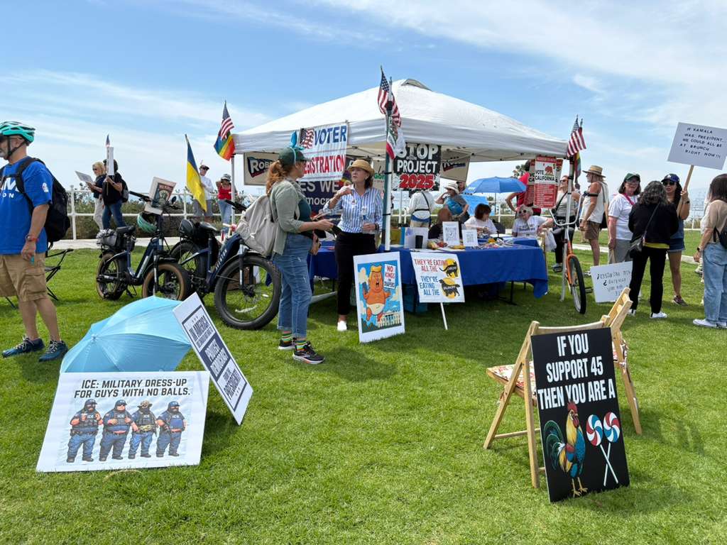 La manifestazione di Long Beach si svolge quasi integralmente nel parco sopra la scogliera e, forse in omaggio all’oceano che romba, è imponente. Di nuovo osservo il cinguettare complice tra quelli a bordo strada e quelli in macchina. Qui pare quasi che si siano messi d’accordo: molti hanno portato sedie da spiaggia e stanno comodamente seduti con il cartello sulle ginocchia, mentre gli automobilisti, oltre a pigiare sul clacson, esibiscono cartelli dai finestrini o attaccati sui cofani. Dietro di loro, nell’erba perfetta del parco, prende vita una vera festa, che assomiglia molto a una sagra di paese: una lunga fila di stand e bancarelle, che però non vendono churros e caramelle, ma slogan e informazioni per diventare attivi nel movimento. Alcuni raccolgono firme.