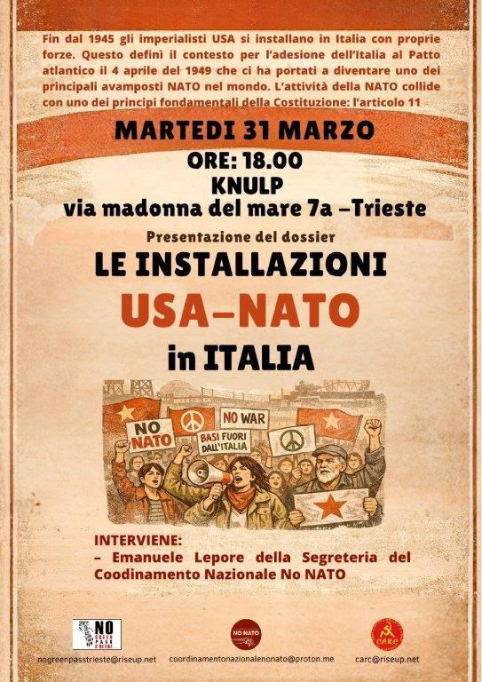 A questo proposito, martedì 31 marzo alle 18.00, presso il bar Knulp di via Madonna del Mare 7/a, terremo, assieme al Partito dei Carc, la presentazione del dossier “Le installazioni Usa-Nato in Italia” a cura del Coordinamento Nazionale No Nato. Sarà presente Emanuele Lepore, della segreteria del Coordinamento.