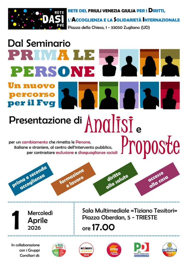 Mercoledì 1 aprile 2026, alle ore 17.00 presso la Sala Multimediale «Tiziano Tessitori» di Piazza Oberdan 5 a Trieste, la Rete DASI FVG — Rete del Friuli Venezia Giulia per i Diritti, l’Accoglienza e la Solidarietà Internazionale — presenta il documento conclusivo del seminario Prima le Persone. Un nuovo percorso per il Fvg.