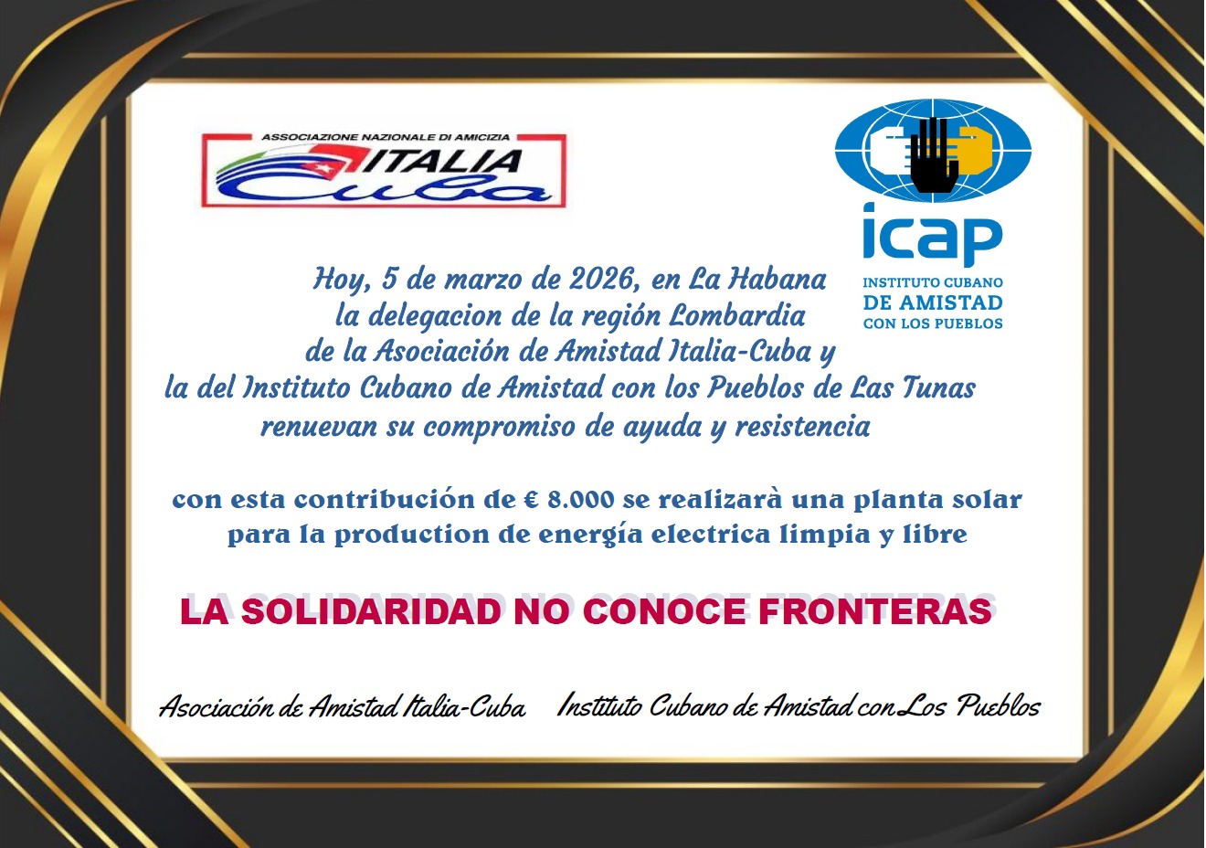 Oggi io stesso, che mi trovo qui anche per conto dell’Associazione Nazionale di Amicizia Italia Cuba (ANAIC) della quale faccio parte, ho svolto una missione che mi ha riempito il cuore. I circoli lombardi dell’ANAIC sono gemellati da oltre trent’anni con la delegazione dell’ICAP (Istituto Cubano di Amicizia con i Popoli) della provincia di Las Tunas; non è un gemellaggio formale, ma un rapporto vivo e dinamico, grazie a cui la solidarietà da semplice formula si trasforma in aiuto concreto. L’anno scorso, quando in quella provincia si ruppe l’unica TAC disponibile, senza possibilità alcuna di reperire i pezzi di ricambio per via del suddetto assedio, i circoli della Lombardia si fecero prontamente carico, con moltissime donazioni da parte dei soci, dell’acquisto dei necessari ricambi e del loro invio a Cuba. Oggi invece con una nuova raccolta fondi fra tutti i soci abbiamo risposto alla loro richiesta di aiuto proprio per installare un impianto fotovoltaico con accumulo per la somma di 8.000 euro. Consegnare di persona questo aiuto concreto nelle mani della segretaria dell’ICAP di Las Tunas Maria Romero Rodriguez è stato per me un momento molto emozionante.