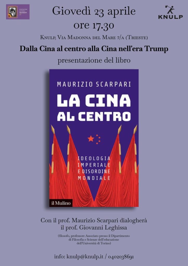 all’incontro “Dalla Cina al centro alla Cina nell’era Trump”. Il prof. Maurizio Scarpari, autore del libro La Cina al centro. Ideologia imperiale e disordine mondiale (Il Mulino), dialogherà con Giovanni Leghissa (Università di Torino).