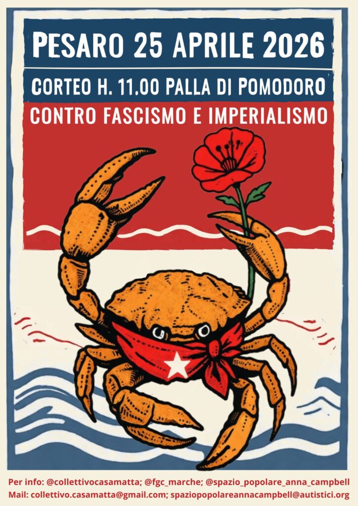 Il 25 aprile, a Pesaro, alle ore 11 dalla Palla di Pomodoro partirà il corteo cittadino “Per un 25 Aprile resistente, contro fascismo e imperialismo”, promosso da Casamatta, Spazio Popolare Anna Campbell, FGC Marche e Pesaro Antifascista.