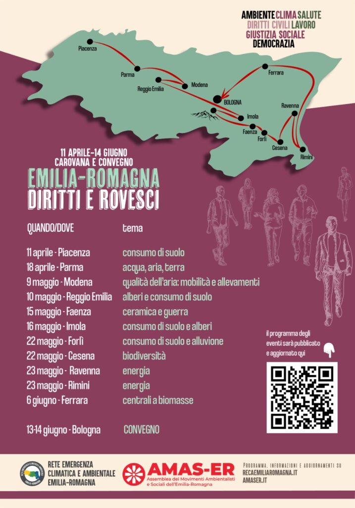 In Emilia Romagna, l’11 aprile è partita una Carovana promossa da RECA (Rete Emergenza Climatica e Ambientale) e da AMAS-ER (Assemblea dei Movimenti Ambientali e Sociali dell’Emilia Romagna). Dopo le prime due tappe a Piacenza e a Parma, e dopo gli attesi appuntamenti nelle altre province emiliane, dalla metà di maggio la Carovana approderà in Romagna, con iniziative – nell’ordine – a Faenza, Imola, Forli e Cesena, Ravenna e infine a Rimini; per poi continuare nelle settimane successive verso Ferrara e convergere definitivamente a Bologna con un importante convegno regionale il 14 e 15 di giugno.