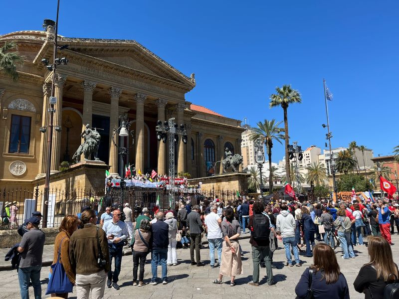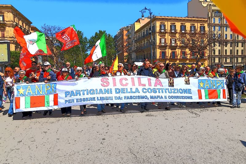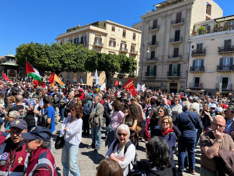 Il corteo giunge a piazza Verdi di fronte al Teatro Massimo poco prima di mezzogiorno; la piazza si riempie per seguire gli interventi dei rappresentanti dell’ANPI Armando Sorrentino, della Cgil Mario Ridulfo e Caterina Altamore che ha parlato in rappresentanza del Coordinamento Donne del Sindacato, dell’Arci Fausto Melluso, delle Donne per la Pace Fausta Ferruzza, del Movimento per il No Davide Ficarra e di altri intervenuti per riaffermare con forza i valori fondanti sanciti dalla Costituzione di ripudio della guerra, contro il fascismo e contro ogni forma di autoritarismo, insieme a una condanna ferma nei confronti delle aggressioni genocidiarie.