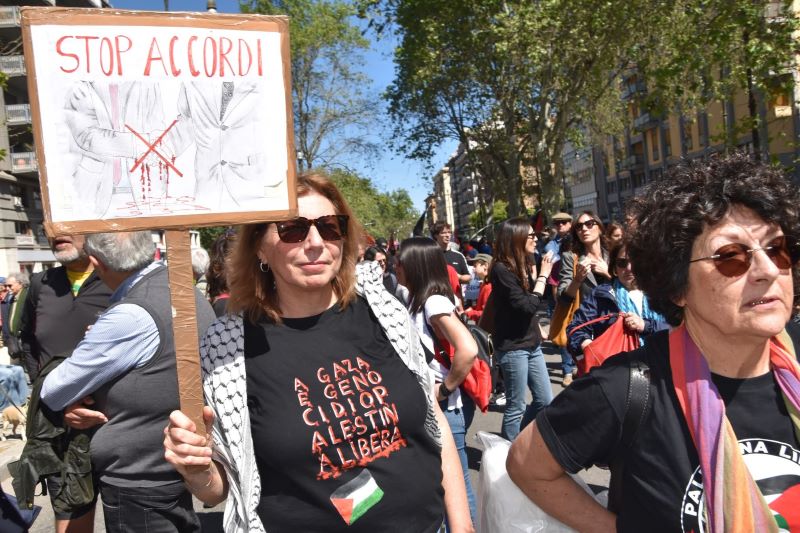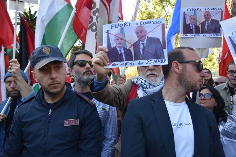 Chiusa la cerimonia istituzionale, dunque, ha inizio il corteo organizzato da ANPI, Cgil, Arci e altre associazioni e i movimenti raccoltatisi nello “Spezzone Antifascista Antisionista Antimilitaista” con la partecipazione di migliaia di manifestanti fra cui si registra una significativa predominanza di presenze di giovani, dimostratisi fra i più attivi a scandire gli slogan che hanno caratterizzato le manifestazioni degli ultimi mesi per incitare a una nuova Resistenza contro il genocidio del popolo palestinese, contro la guerra, contro le politiche aggressive di USA e Israele e contro le politiche securitarie del governo nazionale.