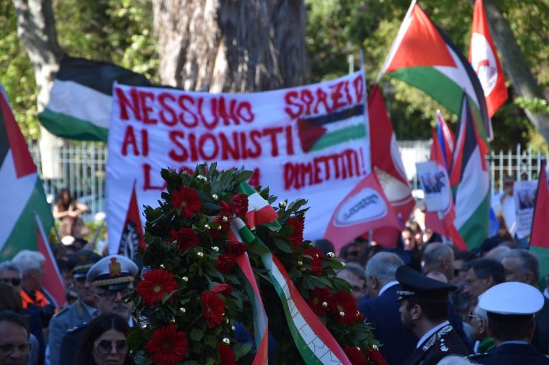 E finalmente il sindaco arriva e prende la parola tra i fischi e gli slogan dei suoi e delle sue concittadine che gli ricordano la vergogna di avere stretto, in occasione di un incontro tenuto nascosto alla città, la mano dell’ambasciatore israeliano. Non saprò mai cosa ha detto. Riesco a sentire, invece, l’intervento di Ottavio Terranova, presidente dell’Anpi cittadina, nonostante qualche più lieve contestazione.