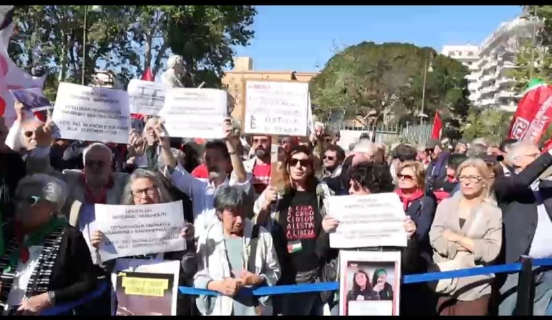 “Potete entrare solo se non dovete protestare”. Così si è rivolto il servizio d’ordine all’unico cancello aperto del Giardino Inglese di Palermo a chi interveniva alle celebrazioni ufficiali del 25 aprile in perfetto orario per l’inizio della cerimonia. Chi si era dato appuntamento poco prima era già dentro e molti erano lì proprio per protestare, cartelli alti e bandiere di partiti, movimenti, associazioni, sindacato. All’ingresso, tra i “ritardatari” mi era stato chiesto di mostrare il cartello che raffigurava una stretta di mano insanguinata con la scritta “Stop accordi” e la richiesta di libertà per Marwan Barghouti e per tutte e tutti i prigionieri palestinesi.