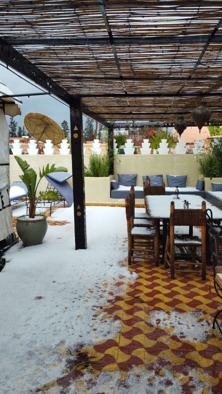 Tra ombrelloni di donne velate che velocemente decorano con l’henné le mani delle turiste, tamburi e flauti di incantatori di serpenti e scimmie al guinzaglio che passano dalle spalle dei proprietari su quelle dei visitatori, Marrakech ci dona qualche squarcio di sole nella terrazza sulla piazza per un pasto veloce e poi, appena il tempo di rientrare nel riad, sprofonda sotto il peso della grandine offrendoci, dalla finestra della camera, un inaspettato panorama bianco su tetti, terrazzi e stradine rosse. Poco più tardi non riusciremo ad attraversarle per raggiungere il nostro pullman che dovrebbe portarci a cena in un ristorante tipico.