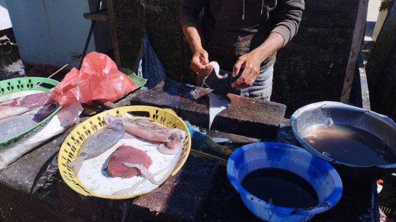 Intanto attraversiamo la foresta di cedri il cui legno vedremo lavorato tra i banchi del mercato. E lo sguardo si apre dal verde della vegetazione ai tetti della città e, finalmente, sull’azzurro del mare. E di mare sa anche il pasto del pranzo consumato alle cinque del pomeriggio dopo aver acquistato il pesce al mercato e avere atteso per l’ultimo turno della brace.