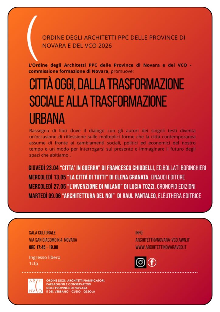 “Un’ipotetica bomba nucleare su Milano, l’assedio di Sarajevo durante la guerra in Bosnia ed Erzegovina, le macerie di Gaza, i droni sul cielo di Falluja, gli attentati alle Torri Gemelle, i militari in mimetica nelle nostre piazze, le telecamere che ci seguono ovunque: che cosa lega elementi e scenari così diversi?” spiega la casa editrice Bollati Boringhieri che ha pubblicato il saggio di Francesco Chiodelli, docente al DIST (Dipartimento Interateneo di Scienze, Progetto e Politiche del Territorio) dell’Università degli Studi di Torino e ricercatore al Centro Interdipartimentale FULL (Future Urban Legacy Lab) del Politecnico di Torino. L’incontro con lui a Novara è svolto nel programma proposto dall’Ordine degli Architetti delle province di Novara e Verbania-Cusio-Ossola alla Sala Culturale (Sala Polivalente Lino Abele Antonione – via San Giacomo, 4).