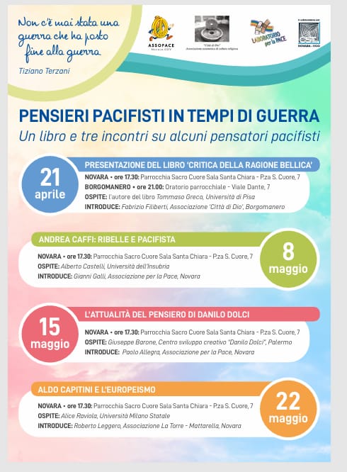 Le 4 ‘tappe’ a Novara e Borgomanero del percorso culturale Pensieri pacifisti in tempi di guerra scandiscono le giornate dal 21 aprile al 22 maggio. Su L’obiezione di coscienza ieri, oggi e domani intervengono i partecipanti al convegno in svolgimento sabato 9 maggio a Fontaneto d’Agogna. E, nell’ambito della serie di incontri a Novara sul tema Città oggi, dalla trasformazione sociale alla trasformazione urbana, giovedì 23 aprile l’autore presenta il libro Città in guerra – Appunti di geopolitica urbana.