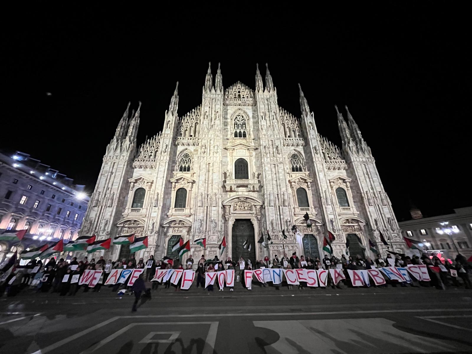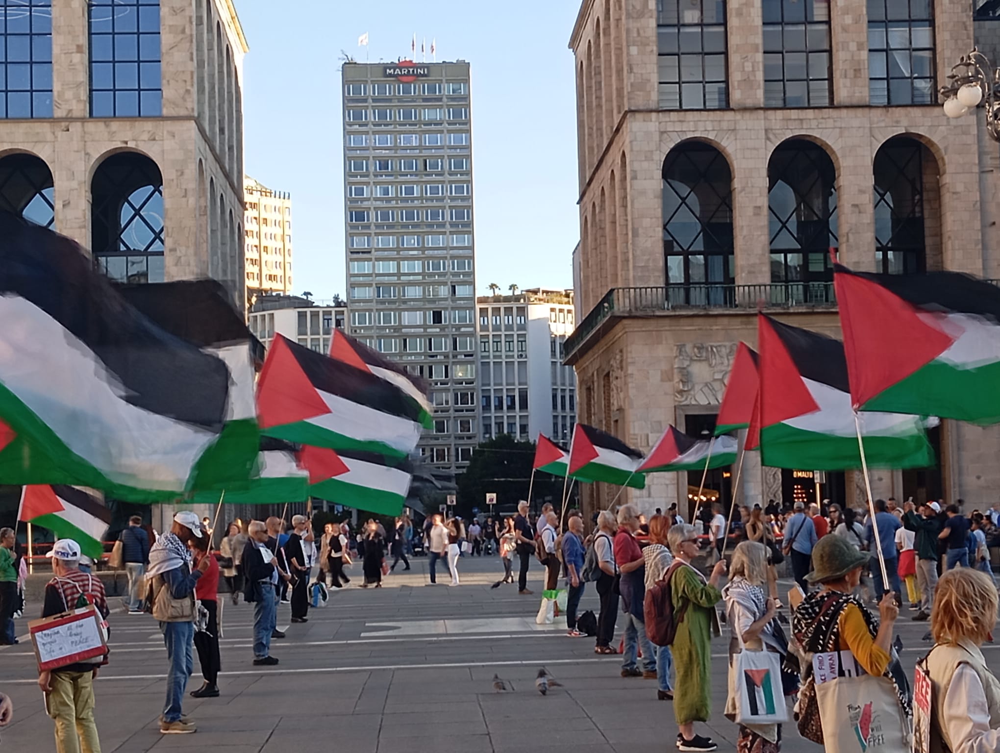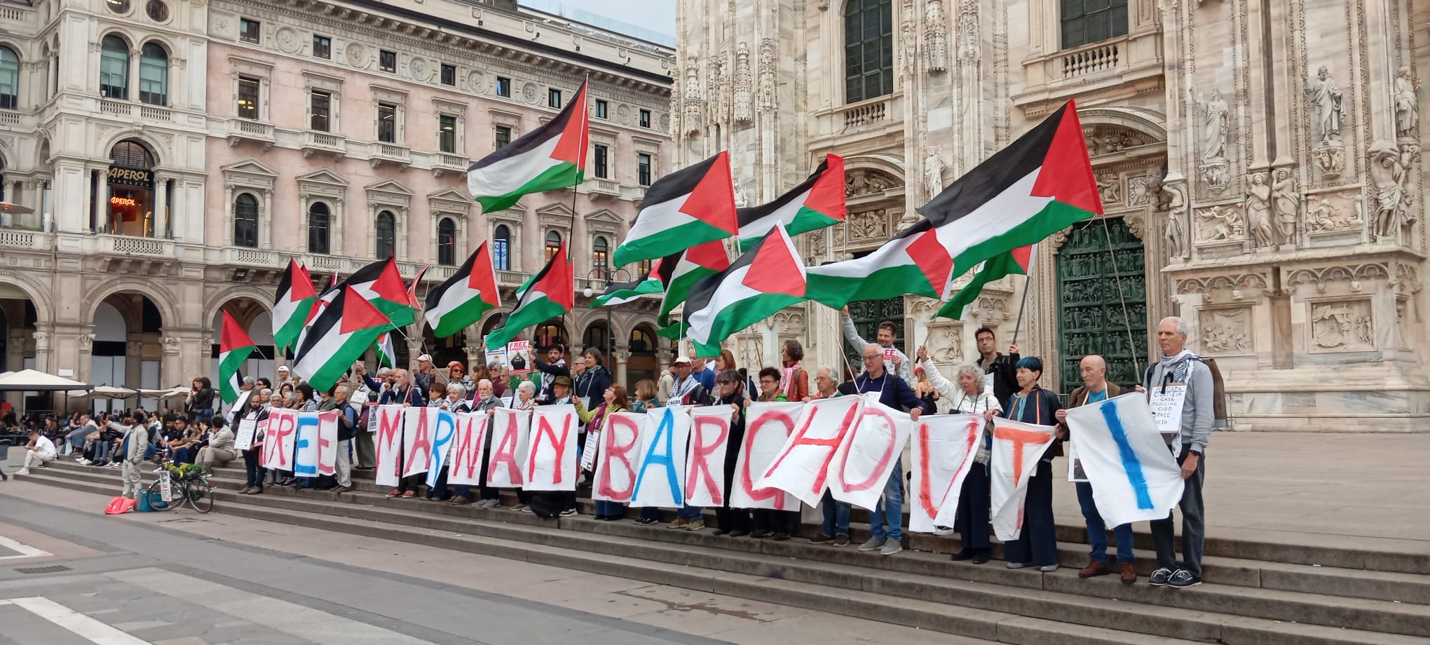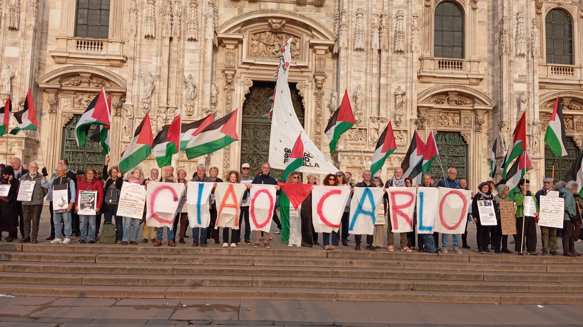 Dieci mesi ininterrotti, ogni giorno dalle 18 alle 19, caldo, freddo, pioggia, vento, in ogni data. In mezzo a una piazza piena quando accendevano l’albero di Natale, a bordo transenne quando passava la fiaccola olimpica, confondendosi nel finale di una manifestazione, così come sarà sicuramente anche il prossimo 25 aprile. Quella piazza dal 16 giugno scorso è anche nostra. Iniziammo in tredici, alla fine della primavera scorsa e ora siamo di nuovo in primavera. Se hanno iniziato portandoci bottigliette d’acqua, poi siamo passati al the caldo e ora stiamo tornando all’acqua. La notte di Natale come la vigilia di Pasqua, sommando alla solita presenza anche una coda notturna, sperando di smuovere coloro che entravano in Cattedrale, con ben poco successo. Il gemellaggio con Cagliari, dove da cinque mesi e mezzo, ogni giorno, resistono in piazza Jenne del centro del capoluogo sardo. E poi piccole e medie città hanno ripreso l’azione dello stare fermi in piazza per far sì che non si spengano i riflettori su Gaza e su tutta la Palestina assediata e violentata.