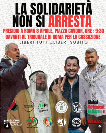 Nella mattinata di mercoledì 8 aprile si terrà l’udienza della Corte di Cassazione a cui hanno fatto ricorso gli avvocati di Mohammed Hannoun, Ra’ed Dawoud, Yaser Elasaly e Ryad Albunstanji. Al presidio di solidarietà con loro, che si svolgerà davanti al “Palazzaccio” di piazza Cavour a cominciare dalle 9:30, che è stato indetto dal comitato che ne chiede la liberazione, hanno già aderito numerose associazioni.