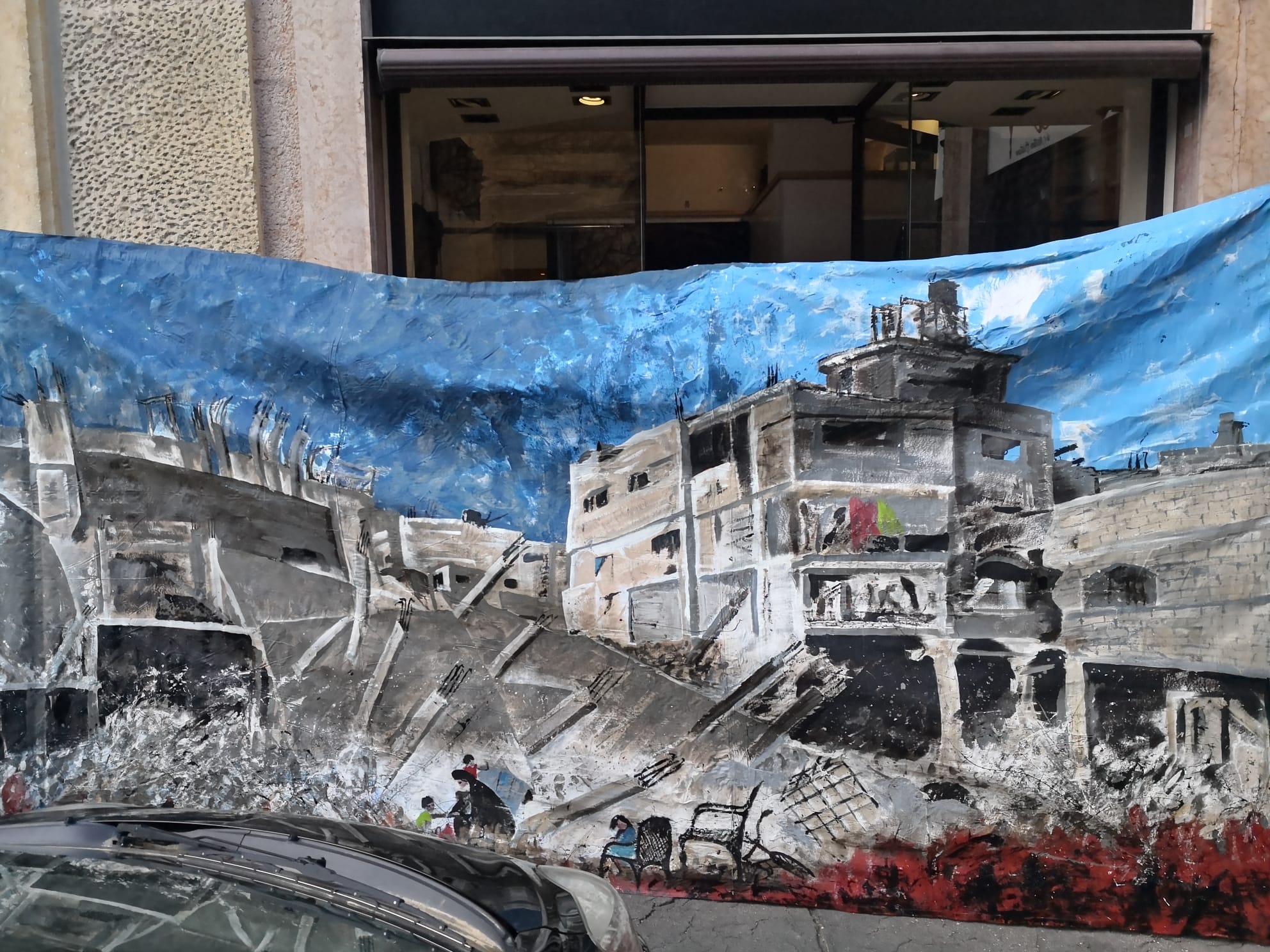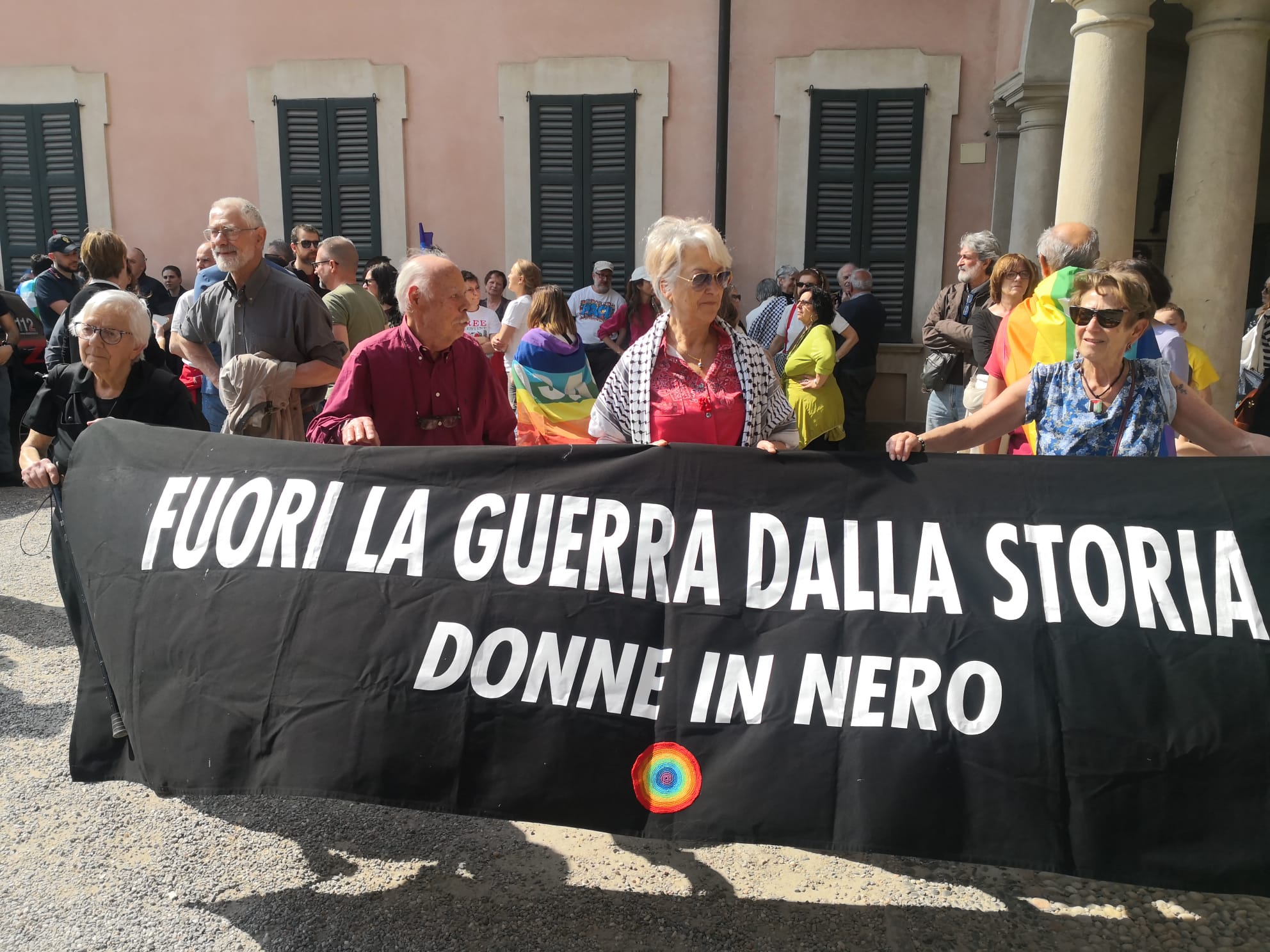 Proseguendo per le vie cittadine, si è arrivati in via Puccini, dove l’artista Andrea Trotti ha voluto esporre al corteo la sua opera “Karamah”, che in arabo significa dignità, onore e resilienza. La grande tela, dedicata alle rovine della guerra, ha attirato l’attenzione di diversi manifestanti, che sono entrati nel suo studio a visionare altre sue opere ispirate alla tragedia di tutte le guerre.