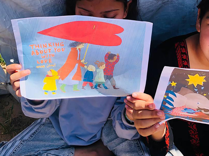 Attraverso il gruppo torinese “Comitato un aiuto per la Palestina” entriamo in contatto con 4 scuole nelle tende per un totale di 180 bambini. I disegni vengono inviati al cellulare degli insegnanti che li mostrano e li fanno scegliere ai bambini. A volte riescono a stamparli e a esporli sulle pareti delle tende. Sono stati già distrutti due volte dalle tempeste e dall’acqua, insieme alle tende delle famiglie, ma si ricomincia e i disegni sono sui telefoni.