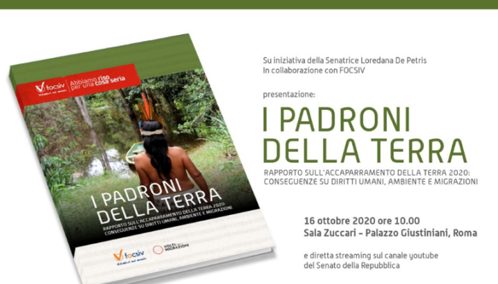 Venerdì 16 ottobre 2020 – ore 10,00, su iniziativa della senatrice Loredana De Petris e in collaborazione con FOCSIV, si terrà a Roma presso la Sala Zuccari – Palazzo Giustiniani – Via della dogana Vecchia, 29 – la presentazione del Terzo Rapporto “I Padroni della Terra. Rapporto sull’accaparramento della terra 2020: conseguenze su diritti umani, ambiente e migrazioni”.