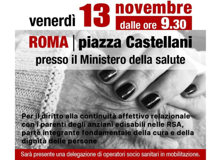 Il comitato che si è costituito tra i familiari dei ricoverati e delle vittime delle RSA rivolge un accorato invito alla popolazione affinché partecipi, anche solo per mezz’ora, al sit-in sotto il Ministero della Salute venerdì 13 novembre dalle ore 9,30 alle ore 13 per chiedere che venga interrotta la tortura psicologica, e spesso anche fisica, cui sono sottoposti gli anziani ricoverati nelle RSA e abbandonati alla morte lontani anche dal minimo conforto offerto dallo sguardo affettuoso di un figlio, di un nipote, o di un vecchio amico più fortunato.