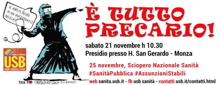 Per queste ragioni, il prossimo 21 novembre l’USB terrà un presidio presso l’Ospedale San Gerardo di Monza. Il presidio che si svolgerà congiuntamente a Potere al Popolo, avrà come temi quelli della salute e tutti quelli – di ordine più generale- strettamente correlati alla tutela della salute e che l’emergenza sanitaria ha reso più evidenti, come quelli legati all’accesso alle cure, reddito, ai sistemi produttivi, alla distribuzione della ricchezza.