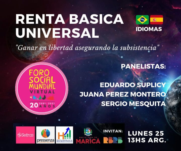 Nell’ambito delle attività del Forum Sociale Mondiale, lunedì 25 alle 17:00 CET si terrà un evento virtuale sul Reddito di Base Universale. Sarà organizzato dalla Rete Umanista Reddito di Base Universale, dall’agenzia di stampa Pressenza e dal Sefras (Servizio Francescano di Solidarietà) e verrà trasmesso attraverso zoom e le reti sociali, i cui riferimenti sono alla fine di questo articolo.