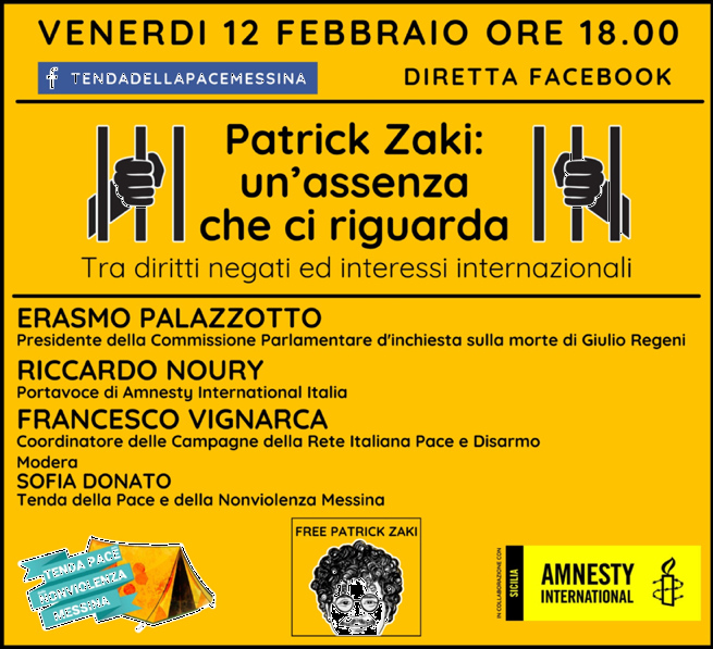 Dopo il flashmob organizzato lunedì 8 dal Collettivo “Tenda della Pace” di Messina, in occasione dell’anniversario dell’arresto del ricercatore e attivista per i diritti umani Patrick Zaki, ancora detenuto in Egitto con l’accusa di propaganda sovversiva, venerdì 12 febbraio alle ore 18.00, in collaborazione con Amnesty International Sicilia, si terrà la diretta facebook “Patrick Zaki: un’assenza che ci riguarda – Tra diritti negati e interessi internazionali”, accessibile al seguente link: www.facebook.com/tendadellapacemessina