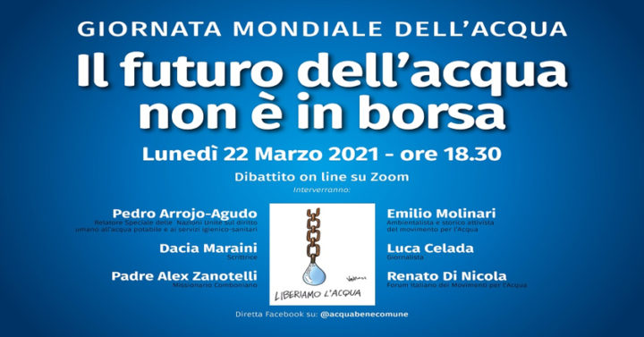 In occasione della Giornata Mondiale dell’Acqua, lunedì 22 Marzo, alle ore 18.30 il Forum Italiano dei Movimenti per l’Acqua organizza il dibattito on line “Il futuro dell’acqua non è in Borsa” a cui parteciperanno: Pedro Arrojo-Agudo (Relatore Speciale delle Nazioni Unite sul Diritto Umano all’Acqua Potabile e ai Servizi Igienico-sanitari), Dacia Maraini, “la signora dell’acqua” per il suo costante impegno a difesa di questo bene comune, Padre Alex Zanotelli (Missionario Comboniano), Emilio Molinari (Ambientalista e storico attivista del movimento per l’Acqua), Luca Celada (Giornalista) e Renato Di Nicola (Forum Italiano dei Movimenti per l’Acqua).