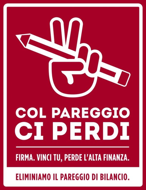 La tua firma per la legge di iniziativa popolare per eliminare il pareggio di bilancio dalla Costituzione è una firma contro politiche di austerità disastrose e per un nuovo modello economico. Non solo per rimediare a una fallimentare modifica della nostra Costituzione, ma anche per dare un segnale concreto per cambiare radicalmente le attuali politiche europee e per la costruzione di un’Europa sociale e dei diritti. E’ quindi una scelta contro il fiscal compact.