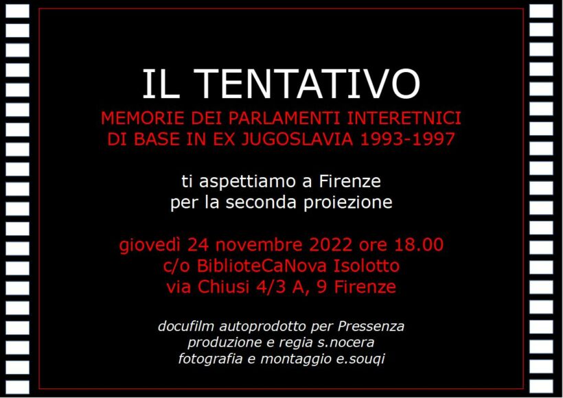 Nel contesto della rassegna della Piccola scuola di pace Gigi Ontanetti, il 24 novembre prossimo alle ore 18.00 avrà luogo alla BiblioteCaNova di Firenze la seconda proiezione (dopo la prima a Roma durante l’Eirenefest il 4 giugno scorso) del documentario “Il tentativo. Memorie dei parlamenti interetnici di base in ex Yugoslavia” prodotto da Pressenza, con la collaborazione di Multimage APS.