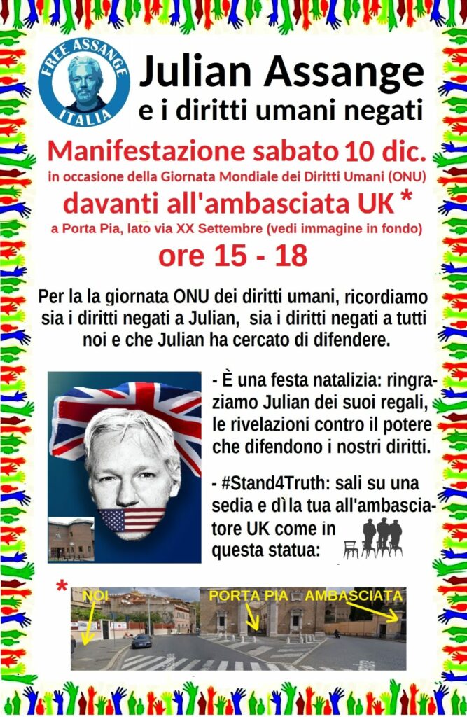 Nella Giornata mondiale dell’ONU dei Diritti Umani, sabato 10 dicembre dalle 15 alle 18.00, il Gruppo FREE ASSANGE Italia manifesterà con un sit-In e festa natalizia* di fronte all’Ambasciata del Regno Unito (Porta Pia, lato Via XX Settembre) per chiedere che venga posta fine alla ingiusta e disumana detenzione di Julian Assange, chiedendo quindi che non venga estradato negli Stati Uniti.