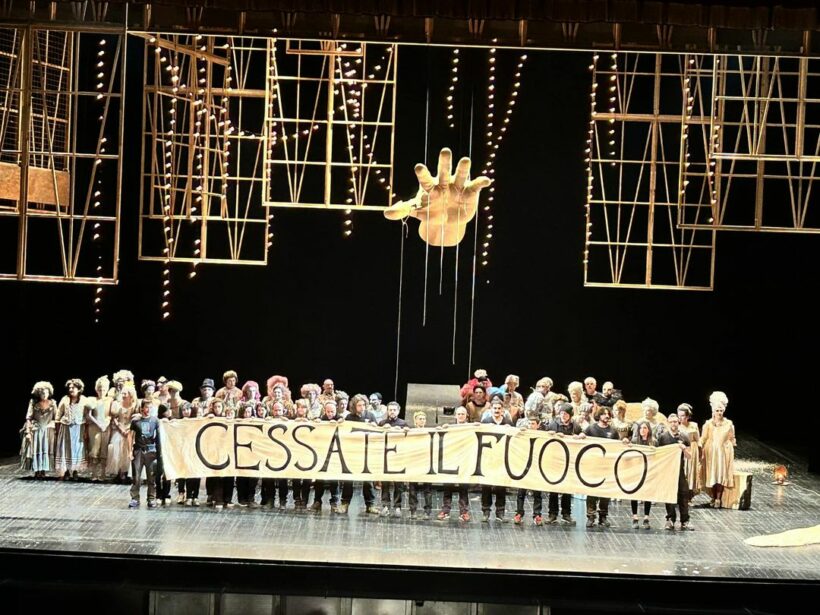 Dopo il Teatro San Carlo di Napoli e la Scala di Milano un altro teatro lancia un messaggio di pace: ieri sera, al termine della prima dell’”Elisir d’amore” di Donizzetti, gli artisti e le maestranze del Teatro Regio di Parma hanno srotolato un grande striscione con la scritta “Cessate il fuoco”. Il pubblico ha risposto con un fragoroso applauso.