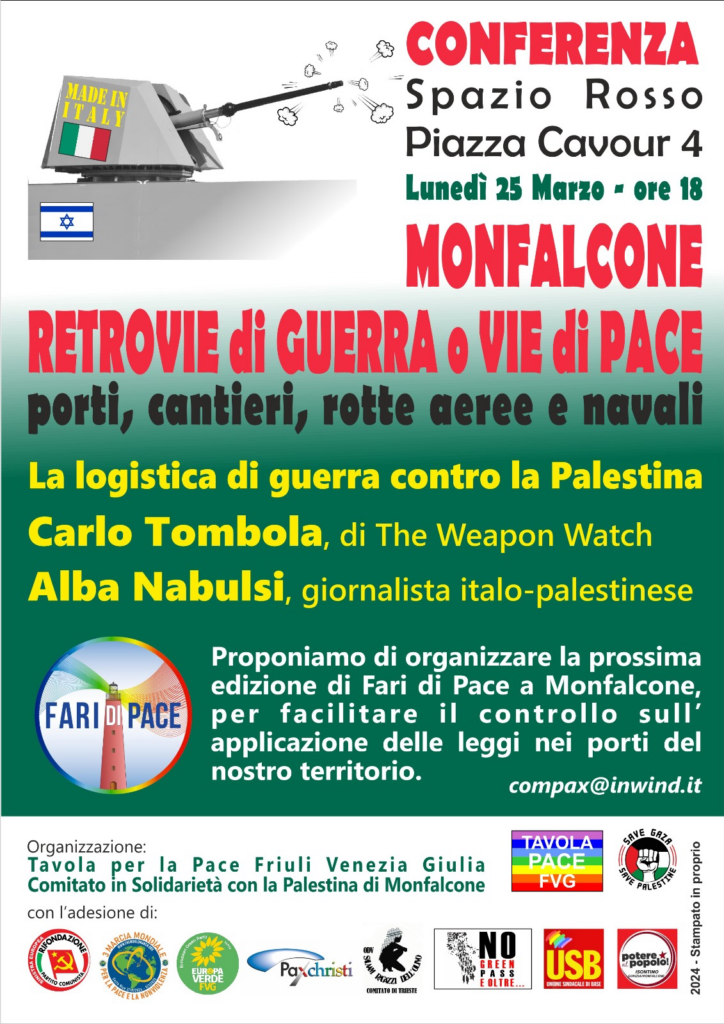 Lunedì 25 marzo alle ore 18.00 presso lo Spazio Rosso di piazza Cavour 4 a Monfalcone la Tavola per la Pace del Friuli Venezia Giulia e il Comitato in solidarietà con la Palestina promuovono una conferenza dedicata alla logistica di guerra, che muove molteplici interessi anche dalla nostra Regione in violazione della legge 185/’90, dei Trattati internazionali sul commercio delle armi e della Costituzione Italiana.