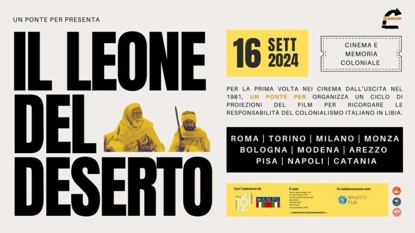 Il 16 settembre 2024 Un Ponte Per riproporrà nelle sale in dieci città italiane il film sulla resistenza libica alla colonizzazione italiana “Il leone del deserto” a sostegno della proposta di istituire una Giornata del ricordo delle vittime del colonialismo italiano.