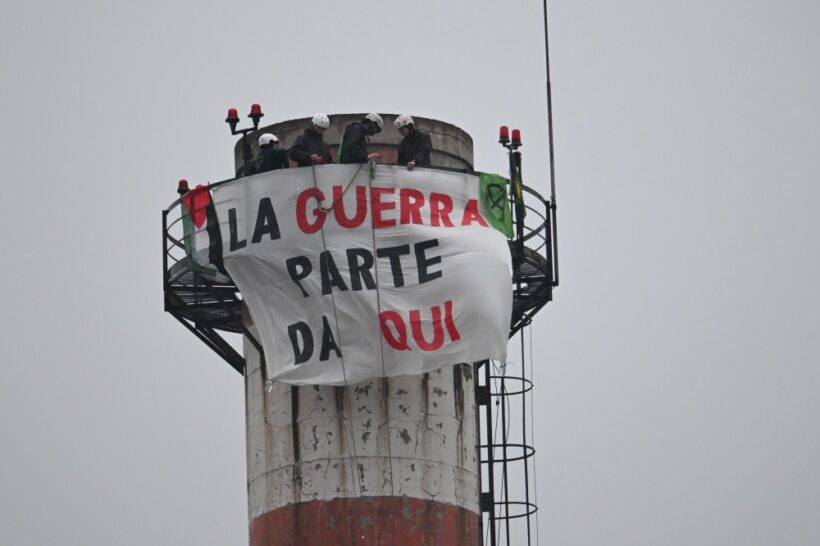 Extinction Rebellion ha realizzato una grande scritta, “Life Not War”, sulla ciminiera della sede di Leonardo, azienda leader nell’industria militare. Il movimento internazionale denuncia le responsabilità di Leonardo e del governo italiano nella vendita di armi impiegate in bombardamenti indiscriminati in diverse aree del mondo e l’aumento dei fondi destinati al riarmo, a scapito degli investimenti per la transizione ecologica e la sicurezza sociale.