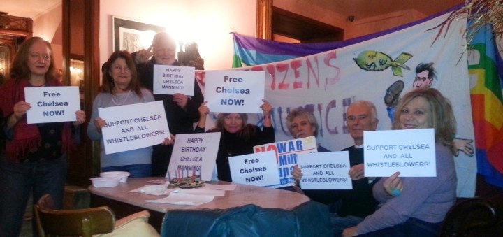 17-12-2015: Auguri a Chelsea (Bradley) Manning per i suoi 28 anni,da esponenti della Rete NoWar e di Statunitensi per la Pace e la Giustizia, riunitisi al storico Café della Pace in via della Pace a Roma.