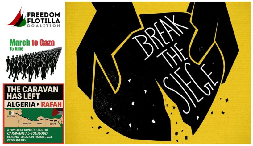 Le iniziative della Freedom Flotilla Coalition sono svolte all’insegna del motto Break the siege on Gaza (Rompiamo l’assedio di Gaza) e sostenute dai coordinatori delle due mobilitazioni, la Global March to Gaza e la Sumud Caravan, che puntano a convergere al valico di Rafah.
