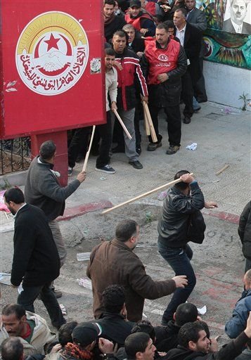 Il partito islamico Ennahdha, maggioritario nella coalizione che regge il governo di transizione tunisino, esce per l’ennesima volta indebolito. Ma non ha tardato a rispondere: il 4 dicembre, i cosiddetti “Comitati di protezione della rivoluzione” hanno assediato la sede nazionale dell’UGTT nel centro di Tunisi, dove si sarebbe dovuta svolgere una commemorazione per i sessant’anni dall’uccisione di Farhat Hached, fautore dell’unione sindacale e militante anti colonialista. Le ricostruzioni dei fatti sono discordanti, anche se è assodato che l’assedio alla sede del sindacato ad opera di una folla che incitava a fare “pulizia” dell’UGTT non fosse certo amichevole. Il servizio d’ordine del sindacato è intervenuto con dei bastoni nel momento in cui alcune persone tentavano di sfondare la porta sul retro della loro sede, secondo alcuni, mentre altri affermano che l’assembramento dei comitati fosse pacifico e che l’attacco sia stato sferrato dai sindacalisti. La polizia, singolarmente assente, ha continuato a non rispondere alle varie richieste d’intervento da parte dell’UGTT ed è arrivata solo al termine degli scontri. Diversi i feriti tra i sostenitori del sindacato che non hanno fatto in tempo a rifugiarsi nella sede.