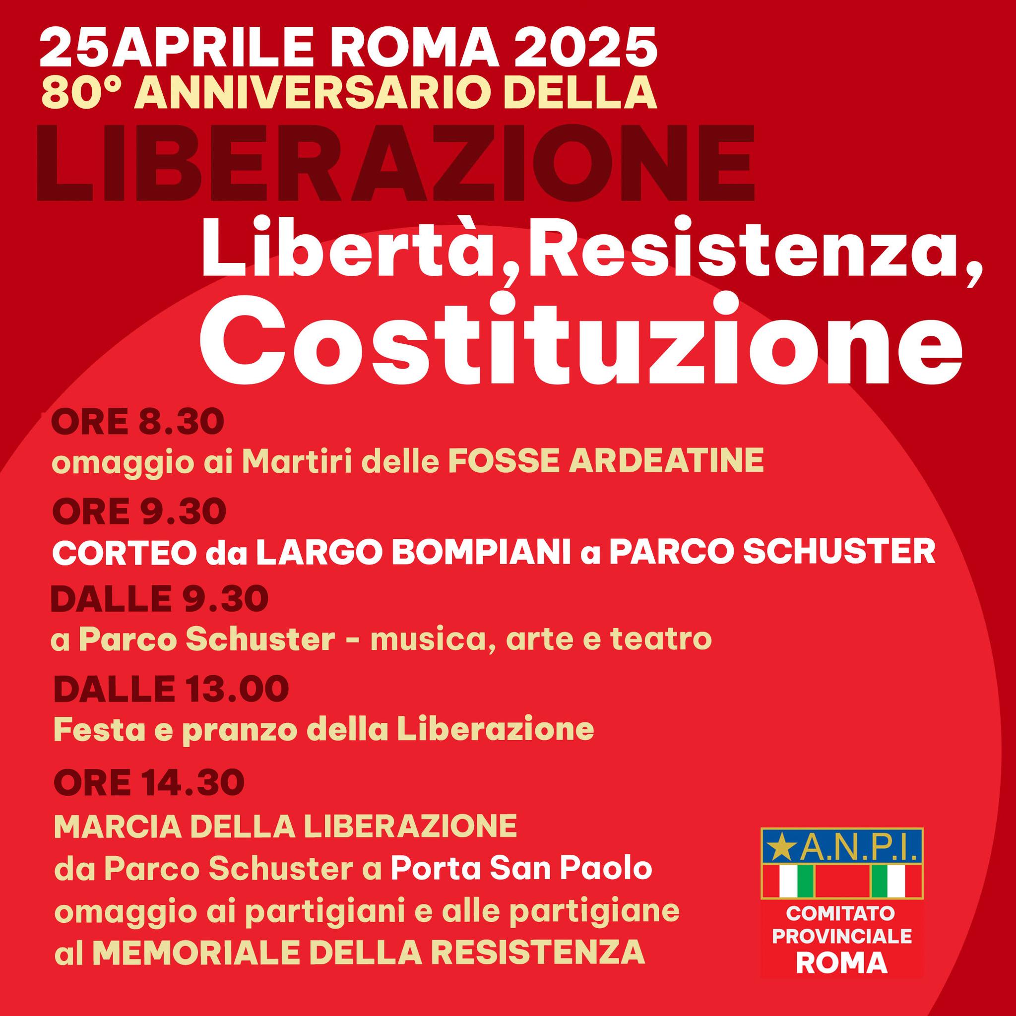 Per il prossimo 25 aprile, 80° anniversario della Liberazione, l’ANPI provinciale di Roma darà vita ad una manifestazione e ad una giornata più ampia rispetto agli anni precedenti. Come sempre si inizierà con l’omaggio ai Martiri delle Fosse Ardeatine. Il…