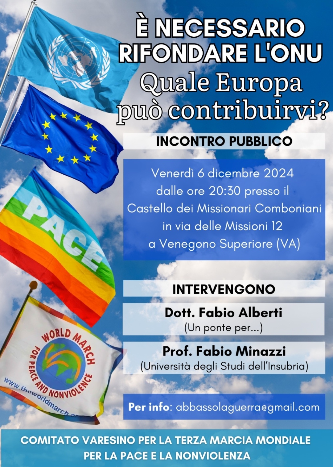 Il Comitato Varesino per la 3^ Marcia Mondiale per la Pace e la Nonviolenza, che vede la presenza di 52 realtà Territoriali, organizza per venerdì 6 dicembre 2024 presso il Castello dei Missionari Comboniani di Venegono Superiore, dalle ore 20:30, l’incontro: “E’ necessario rifondare l’ONU. Quale…