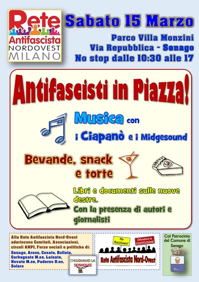 Sabato 15 Marzo 2014, No stop dalle 10:30 alle 17 Parco Villa Monzini Via Repubblica – Senago. Musica con i Ciapanò e i Midgesound Libri e documenti sulle nuove destre con la presenza di autori e giornalisti. Con il Patrocinio…