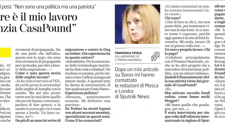 Francesca Totolo, 41 anni, di professione “patriota” e creatrice di fake-news, con nessuna esperienza politica o tecnica su migrazione e Ong, è l’autrice di quell’odioso post che, partendo da una foto in cui Josefa (già a bordo della Open Arms)…