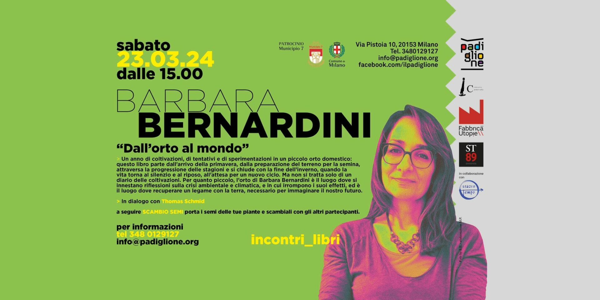Sabato 23 marzo 2024 dalle 15 Via Pistoia 10, Milano Evento di Padiglione – Teatro Musica Idee Barbara Bernardini, autrice del libro “Dall’orto al mondo”, dialoga con Thomas Schmid. Seguirà uno scambio dei semi, con l’invito a portare i semi delle…